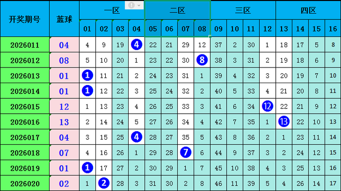 上期蓝球开出号码02,近十期蓝球在一区开6枚,二区开出号码2枚,三区开出1枚,四区开出1枚,区间比6:2:1:1,本期推选蓝球出当今四区,重心暖热13。