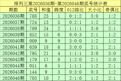 开奖回来:陈设三第2026046期奖号开出:703,组选类型:组六,大小比为1:2,奇偶比为2:1,和值为10,跨度为7。