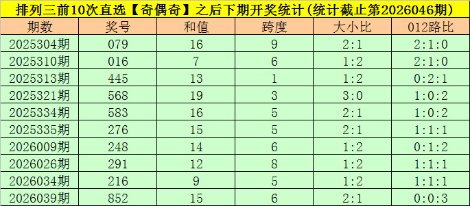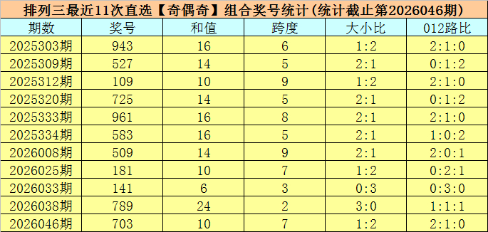 开奖记忆:陈设三第2026046期开出奖号:703,类型为组六,和值为10,奇偶比为2:1,大小比为1:2,跨度为7。