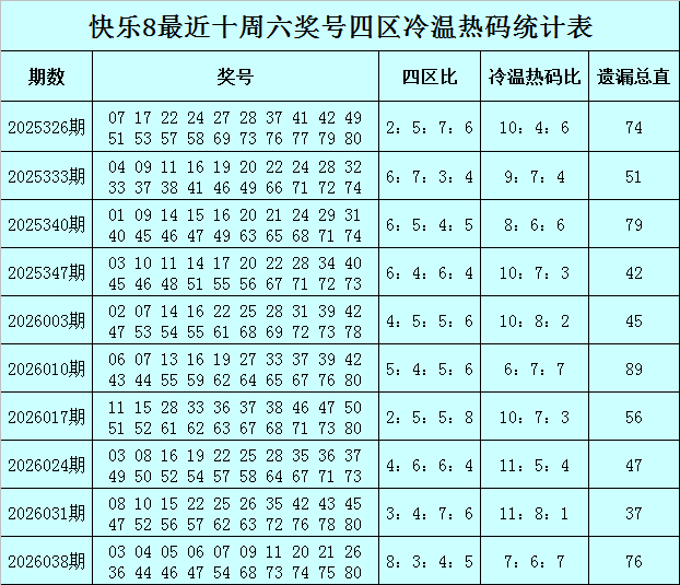 福彩得志8第2026038期(上周六)开奖追思:03 04 05 06 07 09 11 20 21 26 36 44 46 47 54 68 73 74 75 80,其中奖号四区比为8:3:4:5,冷温热码比为7:6:7。
