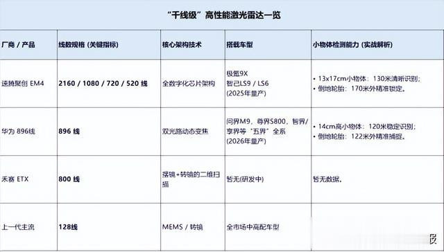 •速腾聚创EM4:以2160/1080/720/520线多规格量产的上风,领先为行业劈开高线数时期落地的大山,成为标杆。居品禁受数字化SPAD+VCSEL自研芯片架构,竣事“高线数的芯片化集成”,在小物体检测上展现出顶尖实力,可在130米处精确识别13×17厘米的小物体,170米处踏实探伤倒地轮胎,超远距、高精度的小盘算推算感知才略,大幅擢升了复杂路况与恶劣天气下的行车安全。当今该居品已于2025年7月量产搭载于极氪9X、智己LS9、智己LS6等高端智驾车型,EM平台已斩获13家车企56款车型定点,成为这些车型打造高阶智驾竞争力的中枢硬件复旧。