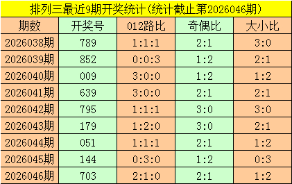 一、摆设三第2026046期开出号码703,其奇偶比为2:1,大小比为1:2,号码012路比为2:1:0。该号码直选历史上出现了8次。