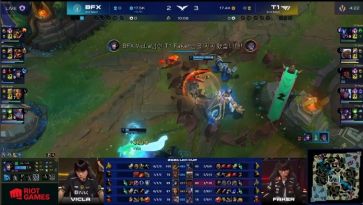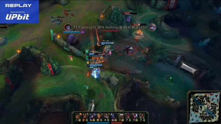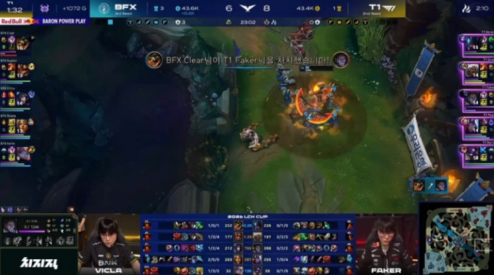 [22:52]下路Clear鳄鱼与Faker单挑,鳄鱼死刑宣告在手单杀Faker,BFX经济跳动1k。