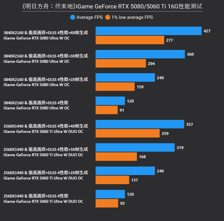 第二款是新游《明日方舟:临了地》,辅助DLSS 4多帧生成期间,4K极高画质+DLSS性能档下,iGame GeForce RTX 5080 Ultra W OC 16GB仍是能跑满120fps上限,重叠2X、3X和4X帧生成则永诀达成240fps、360fps和427fps,餍足超高刷新率需求。