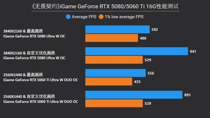 iGame GeForce RTX 5060 Ti Ultra W DUO OC 16GB搪塞2K分辨率也舒缓,最高画质跑到平均556fps,优化画质后则是基本达到900fps门径,这样来看,清晰器才是这款游戏的最终性能瓶颈。