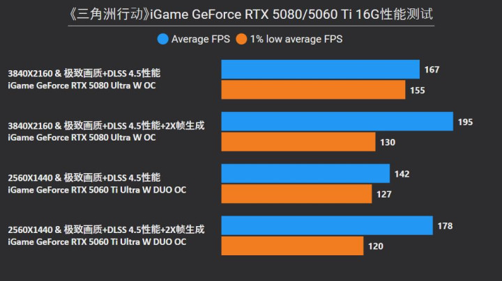 2K分辨率,iGame GeForce RTX 5060 Ti Ultra W DUO OC 16GB开启DLSS性能档也可跑满120fps,使用2X、3X和4X帧生成则永诀达成240fps、319fps和357fps,3X以下和GeForce RTX 5080帧率发扬一致,仅仅分辨率不同。