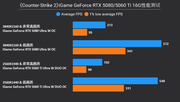 在2K分辨率中,iGame GeForce RTX 5060 Ti Ultra W DUO OC 16GB也有相近似的帧率发扬,相等高画质平均帧率达到192fps,优化以下画质后,平均帧率亦能达成548fps。