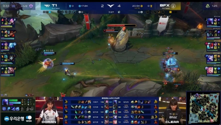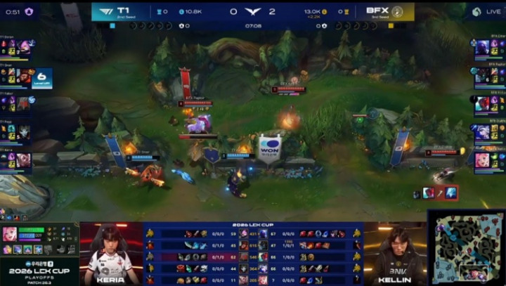 [22:08]中路团战,Faker冰鸟封墙留住Raptor,Vicla永恩趁势开大反打砍掉Keria洛,野区多兰凯南绕后送Diable艾希嘴里,下路络续开战,Diable艾希肉身开团击杀Faker,BFX打出0换4,推掉T1中下高地塔,经济跳跃来到1w以上。