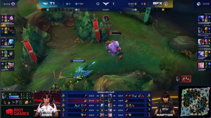 [5:01]Raptor茂凯入侵刷掉T1的F6,两边打野野区交战,Raptor茂凯拍掉Oner山公一血,Faker冰鸟封墙追击Raptor未果,后者残血回到中路塔下按B。